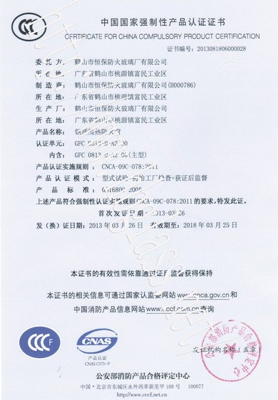鶴山市恒保防火玻璃廠有限公司在陳總經(jīng)理的領導下,跟全體員工的共同努力下,于2013年3月18日通過國家防火建筑材料質(zhì)量監(jiān)督檢驗中心的檢測,最終通過由公安部消防產(chǎn)品合格評定
