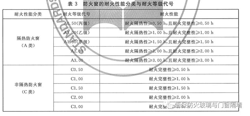 備注:根據(jù)國家標(biāo)準(zhǔn)《防火窗》GB16809-2008,甲級防火窗的耐火性能分類與耐火等級的規(guī)定:耐火隔熱性≥1.50h,且耐火完整性≥1.50h的耐火等級代號是A1.50(甲級);耐火完整性≥1.50h的耐火等級代號是C1.50。所以我們常說的甲級防火窗是指耐火隔熱性≥1.50h,且耐火完整性≥1.50h的防火窗。