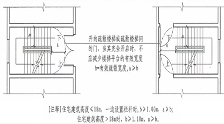 3、開向疏散樓梯或疏散樓梯間的門,當(dāng)其完全開啟時(shí),不應(yīng)減少樓梯平臺(tái)的有效寬度。(6.4.11