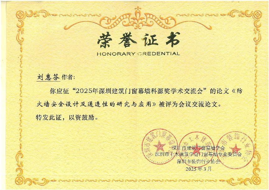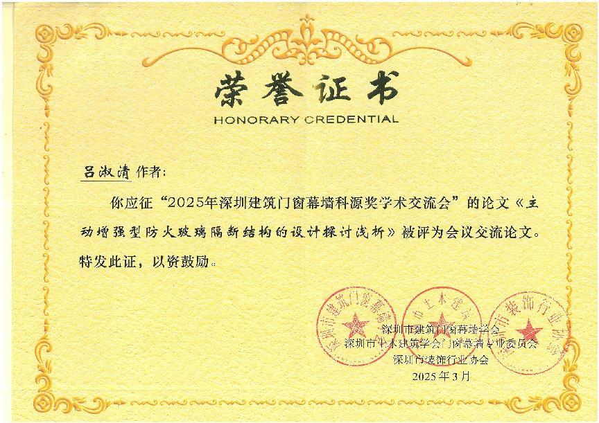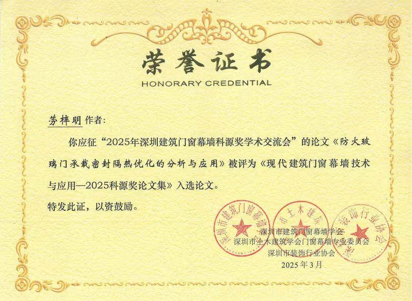 在2025科源獎(jiǎng)獲獎(jiǎng)學(xué)術(shù)論文及學(xué)術(shù)交流先進(jìn)單位頒獎(jiǎng)儀式中,恒保公司共3篇論文榮獲學(xué)會(huì)表彰,其中工程師勞梓明撰寫的《防火玻璃門承載密封隔熱優(yōu)化的分析和應(yīng)用》被評(píng)為《現(xiàn)代建筑門窗幕墻技術(shù)與應(yīng)用——2025科源獎(jiǎng)?wù)撐募啡脒x論文!